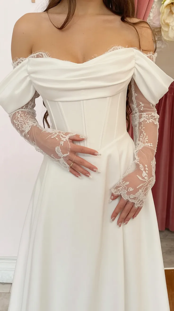 4. Corseted Satin-Inspired Off-Shoulder Dress with Lace Gloves