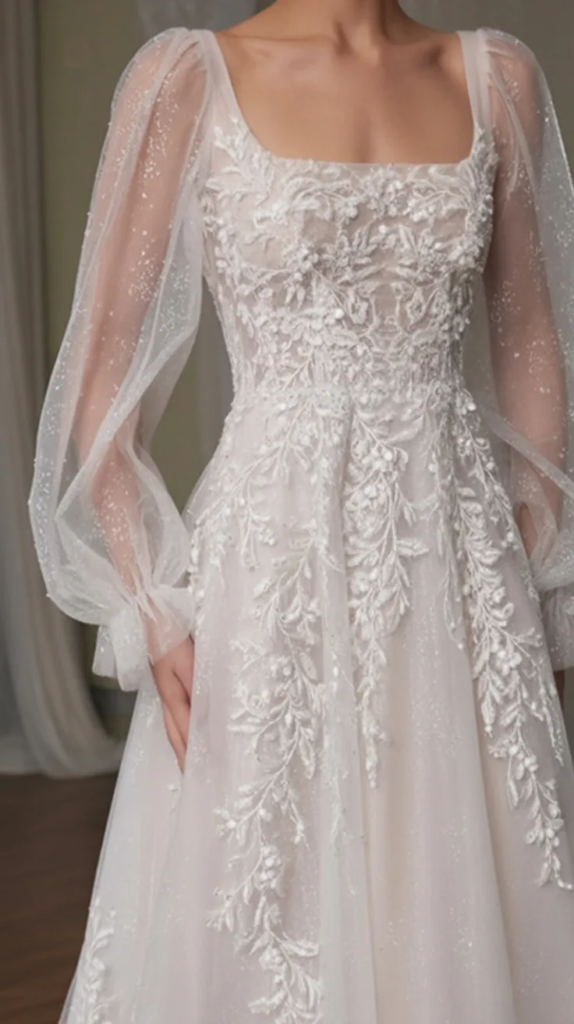 7. Square Neck Glitter Lace A-line with Sheer Sleeves