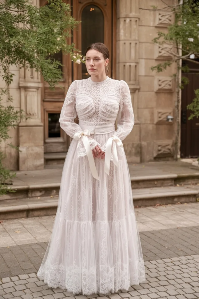 11. Vintage High Neck Lace Gown with Ribbon Cuffs