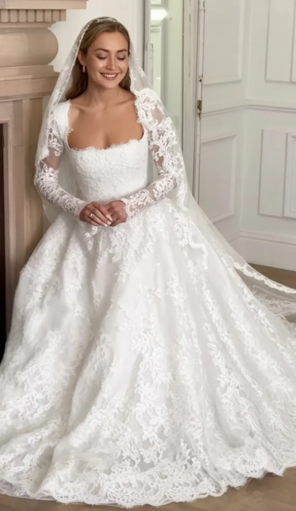 This is a complete bridal look. The combination of lace, sleeves, and veil creates a traditional feel that many brides still prefer.