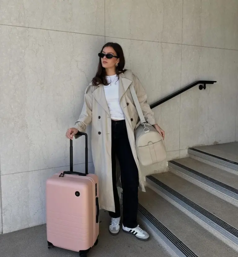 A light beige trench over a white tee and dark jeans with retro sneakers and soft pink luggage exudes effortless elegance.