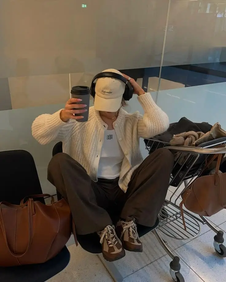 A chunky off-white cardigan with wide brown pants, paired with a cap, sneakers, and a brown tote for total comfort.