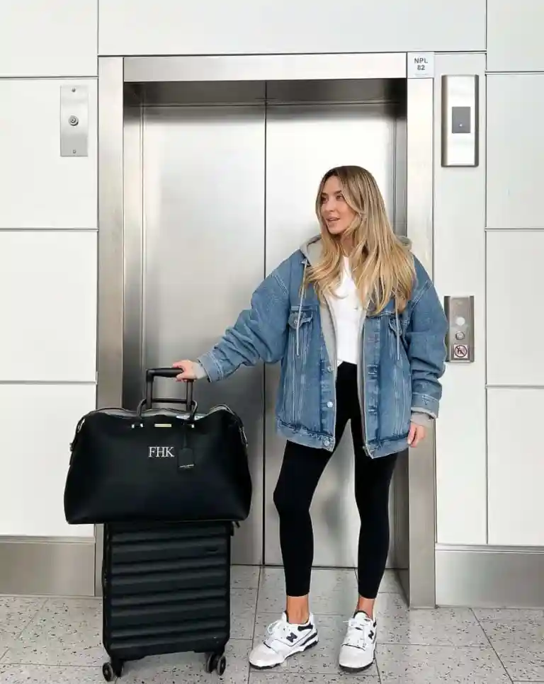 A light wash denim jacket over a white hoodie and black leggings, combined with sporty sneakers and a black weekender bag.