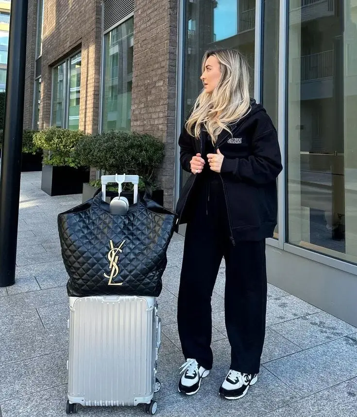 A monochrome black hoodie and joggers look, accented with black-and-white sneakers and a quilted tote for minimal winter style.