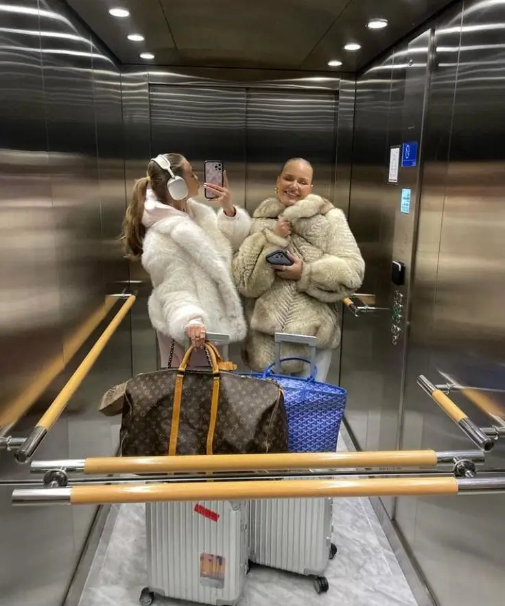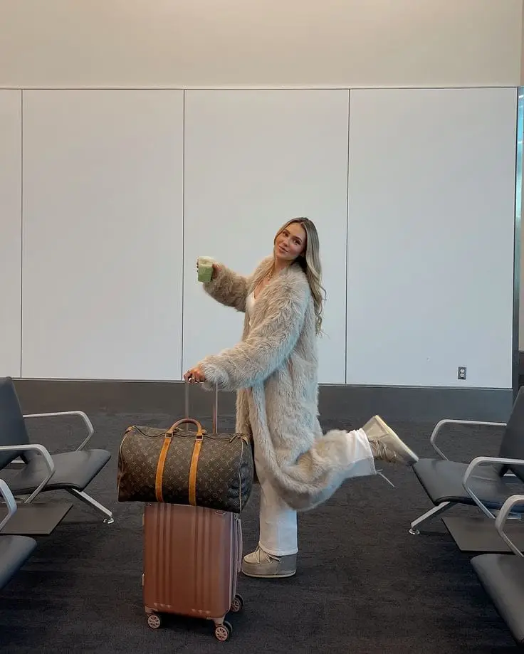 Matching cream faux fur coats over neutral loungewear for a glamorous, first-class feel, completed with oversized headphones and stylish luggage.