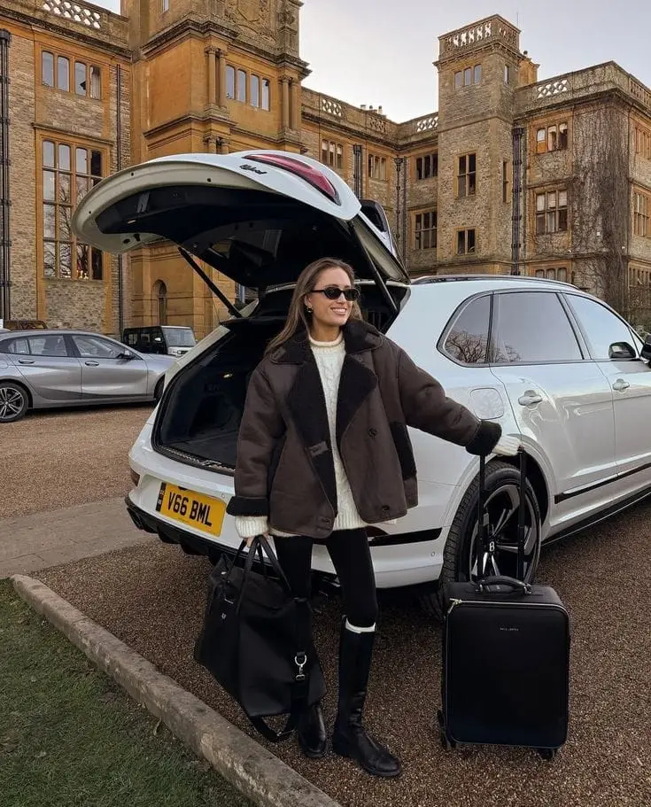 A dark shearling jacket with black leggings, knee-high riding boots, and a knit sweater for countryside-inspired winter chic.