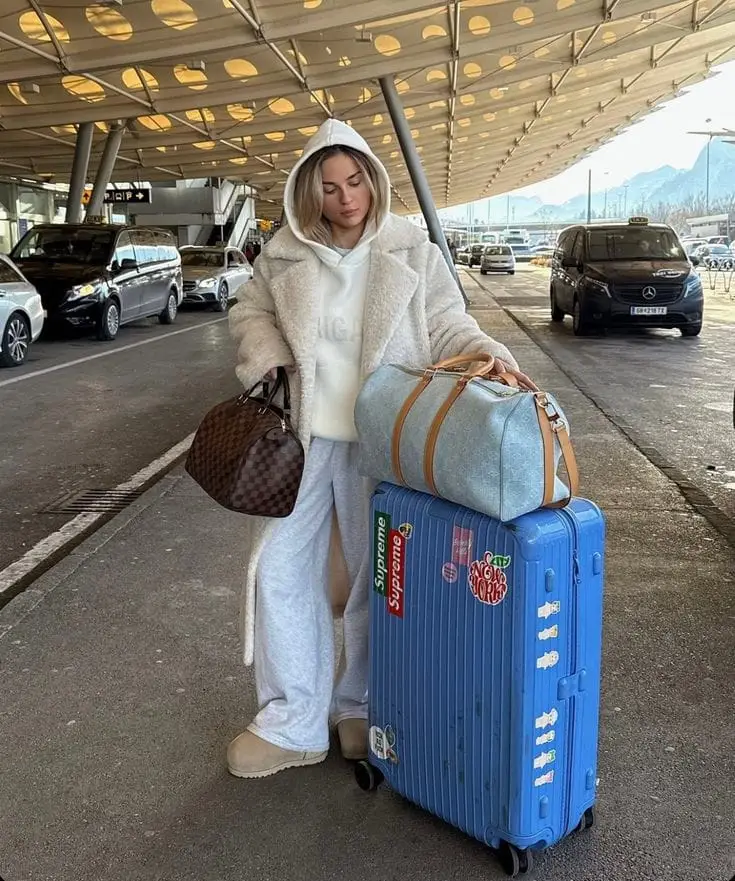 A white teddy coat with matching hoodie and joggers, UGG boots, and travel bags for ultimate cozy airport vibes.