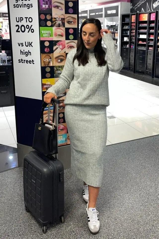 A grey knit sweater paired with a midi skirt, white sneakers, and a black travel bag for a simple, sleek airport look.