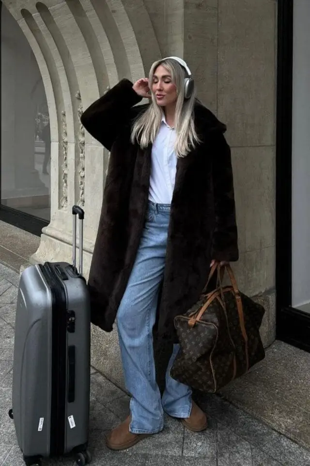A dark fur coat over a white shirt and blue jeans, completed with headphones, suede boots, and a chic carry-on for comfortable jet-setting.