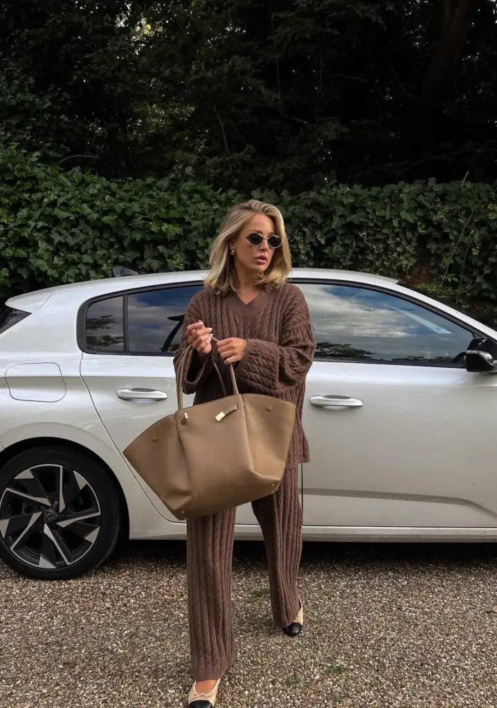 A chocolate cable knit lounge set with flats and a taupe bag for cozy, winter-ready airport looks.
