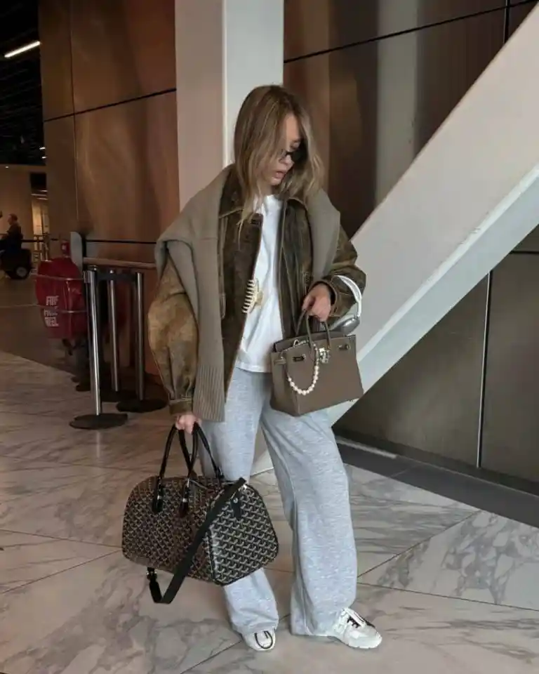 A taupe coat with sweatshirt and relaxed pants, cozy boots, and practical bags for a balanced, stylish travel outfit.