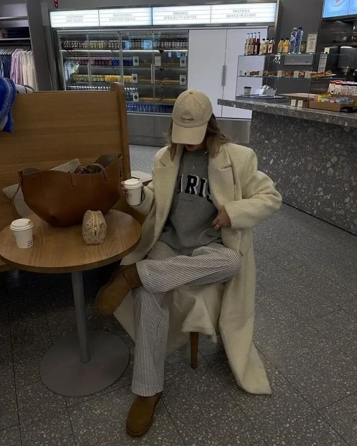 A cream wool coat over a logo sweatshirt and pinstriped pants, completed with tan boots and a baseball cap for relaxed winter vibes.