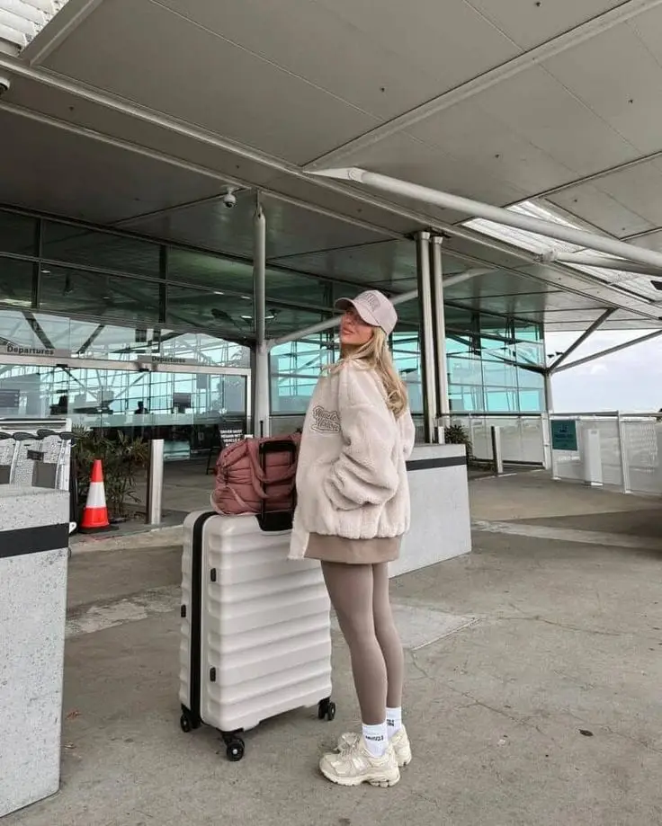 An oversized cream teddy jacket paired with a taupe mini dress, tights, and a cap creates a neutral, effortless look, complemented by chunky sneakers and a crossbody bag for travel ease.
