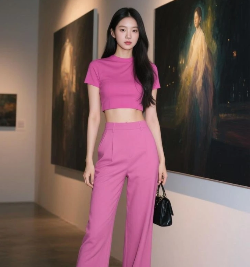 A magenta co-ord set instantly brings sophistication to a winter date night. The cropped top and high-waisted wide-leg pants create a balanced silhouette that feels modern and intentional.