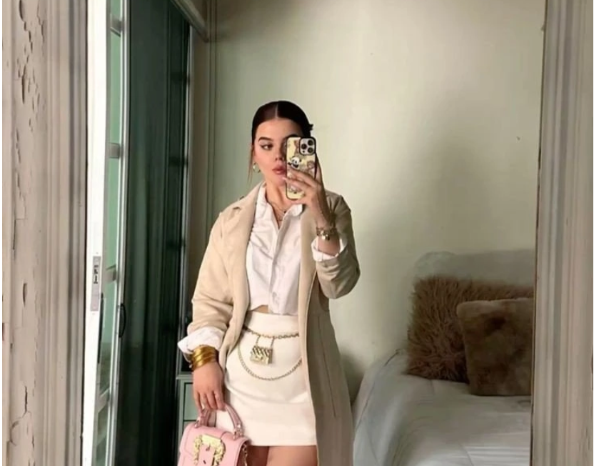 A cream oversized blazer paired with a white mini skirt creates a clean and modern silhouette. The neutral palette feels fresh and elegant for winter.