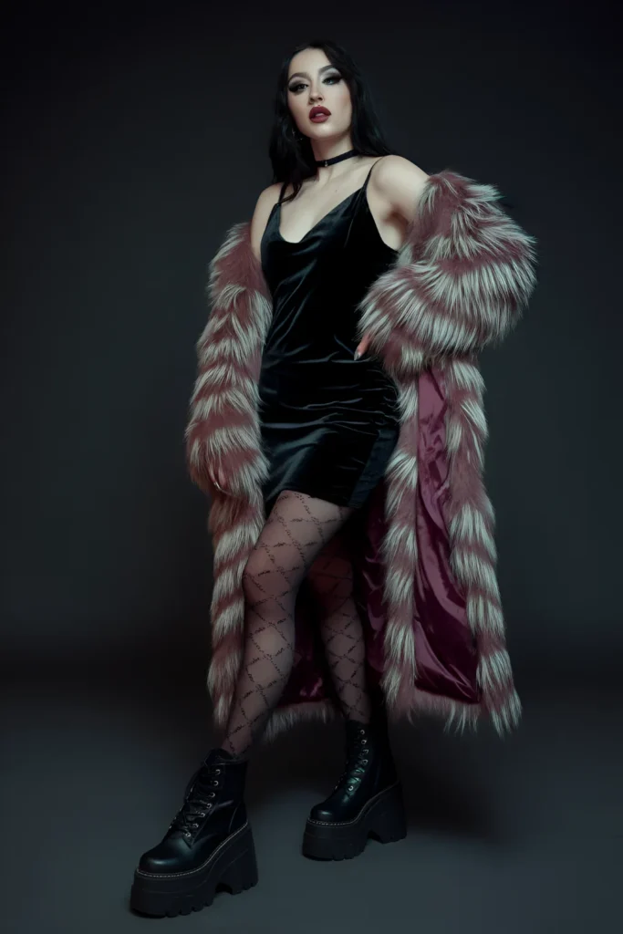 This outfit revolves around a rich velvet dress styled for winter comfort. Thick hosiery and statement boots add insulation and height. A dramatic coat enhances both warmth and elegance. It’s ideal for evening plans or special seasonal gatherings.