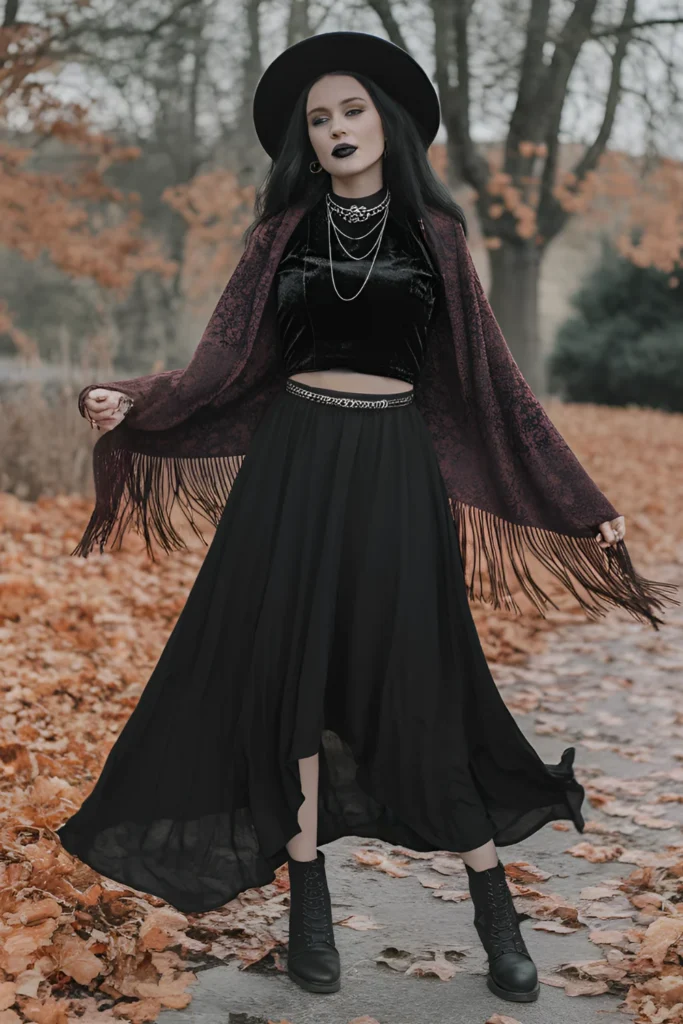 Flowing silhouettes and layered outer pieces create a mystical presence. Boots and statement jewelry ground the outfit. It combines warmth with dramatic flair. Ideal for seasonal gatherings or themed nights.