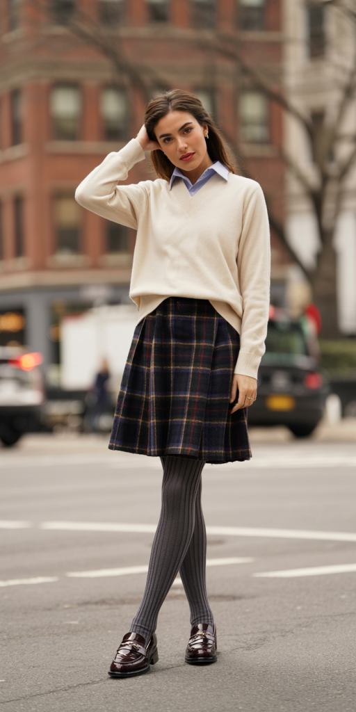 Grey tights add warmth and help tie the outfit together visually. Loafers keep the look practical and grounded, making it suitable for daily activities. The combination of classic layers and comfortable footwear makes this outfit both functional and refined.