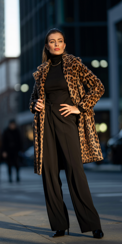 Keeping the rest of the outfit black allows the leopard print to stand out naturally. Neutral pieces balance the overall appearance and prevent the look from feeling overwhelming. This contrast helps the statement coat remain the highlight.
