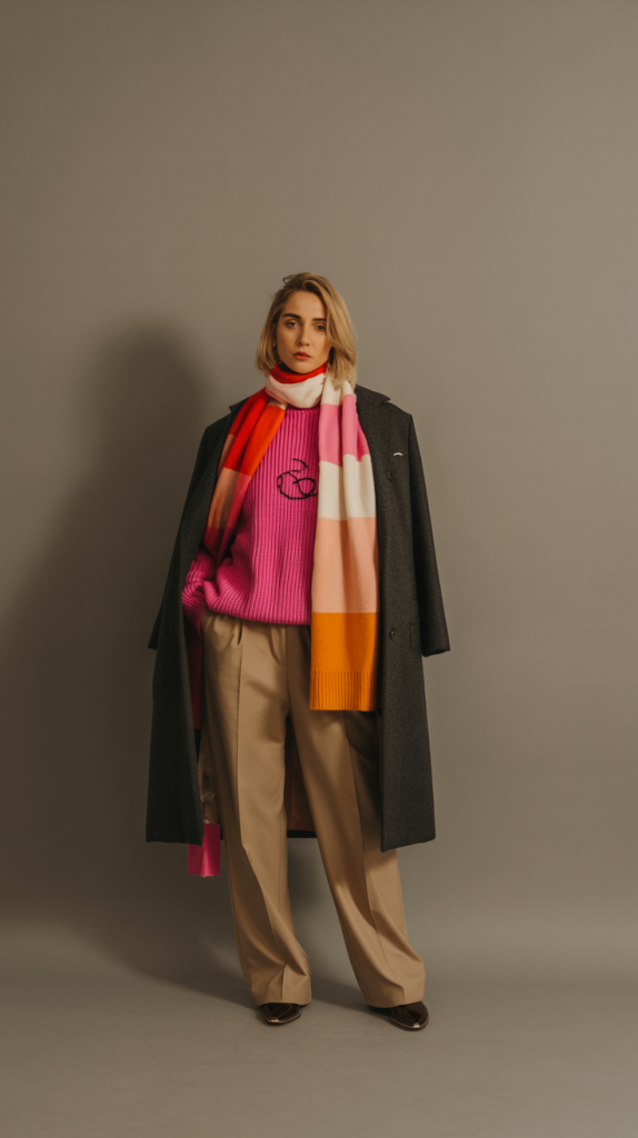 Wool trousers keep the look balanced and grounded. A structured coat brings all the colors together, ensuring the outfit feels intentional. Classic silhouettes help keep the overall look cohesive.